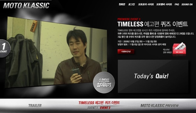 위에서 소개해드린 '모토 클래식(MOTO Klassic)' 티징 사이트 http://www.motoklassic.com 에서 정보만 얻을 수 있는 것이 아니라 여러가지 상품도 건질 수 있는 이벤트가 진행중입니다. 진행중인 이벤트는 예고편을 감상한 후 나오는 퀴즈를 푸는 것으로, 이벤트 상품으로는 영화 예매권을 제공한다고 합니다.