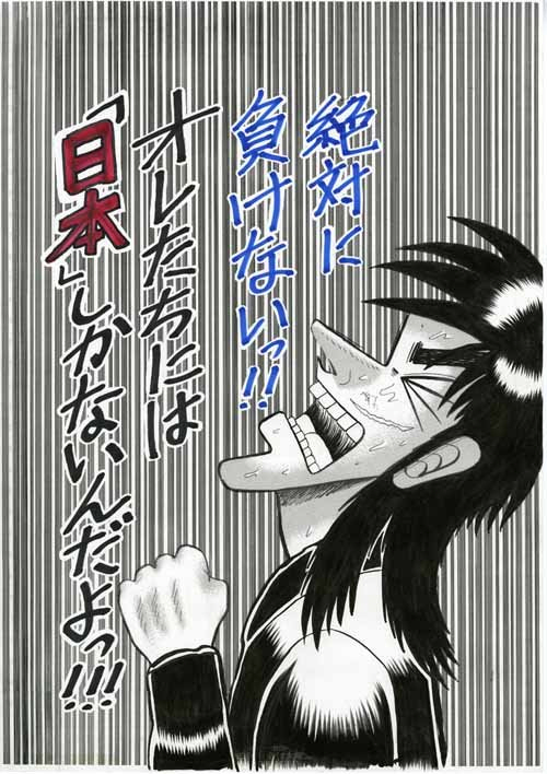 일본 망가 '도박묵시록 카이지' 로 유명한 만화가 '후쿠모토 노부유키' 씨가 동일본 대지진 의연금으로 3,000만엔을 기부하면서 함께 내놓은 것이 바로 절망 속에서 희망을 버리지 않고 어떤 수던 찾아내 결국 살아갈 수 있는 빛 한 줄기를 잡아채는 그가 "절대로 지지 않는다!! 우리들에게는 '일본' 밖에 없어!!!" 라는 이 한 마디가 크게 와닿았습니다. 주간 소년점프의 작가들이 주었던 일러스트 메세지도 용기를 잃지 않고 앞으로 나아가는데 힘이 되지만 작품 속에서 항상 절망 속에서만 살아가는 주인공이다보니 원작에 대한 정보가 조금이라도 있는 이재민 분들이라면 더욱 더 가슴에 와닿지 않았을까 싶습니다.