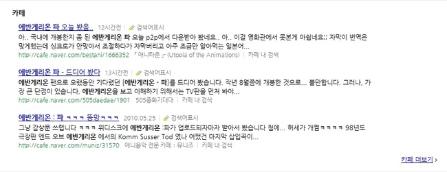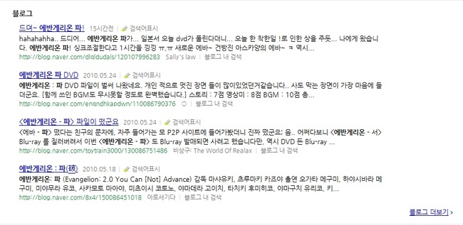 덕분에 극장에서 '에반게리온 파' 를 본 분들이 7만명 정도 였던 것으로 기억하는데 앞으로 일주일 정도 지나면 국내 애니메이션 팬이라 자칭하는 수많은 블로거들의 블로그에 '에반게리온 파' 리뷰가 올라오겠죠. 그런 리뷰들이 7월 쯤 '에반게리온 신극장판 : 파' DVD/BD를 발매한다고 했던 국내 메이커에게 힘이 될지 아니면 독이 될지 궁금하네요. '에반게리온 신극장판 : 서' DVD/BD 지르신 분들, '에반게리온 신극장판 : 파' DVD/BD 지르고 싶으시다면 오늘부터 하나님, 부처님 찾아야 할지도 모르겠습니다.