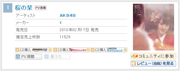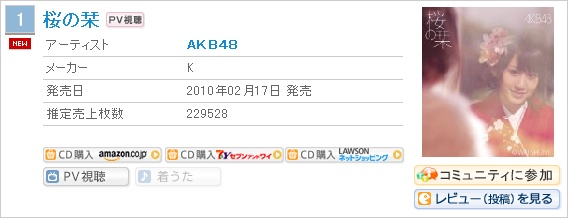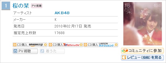 AKB48 의 새로운 싱글인 '桜の栞' 가 오리콘 싱글 데일리 랭킹 1위를 획득했습니다.