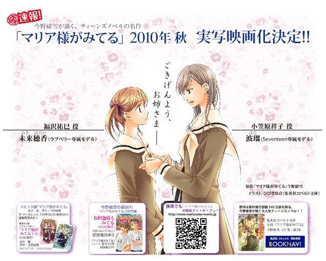 라이트노벨 누계 발행 부수 540만부를 자랑하는 대인기 '마리아님이 보고계서' 가 실사 영화화가 결정되어 Seventeen 전속 모델의 '하루(波瑠)' 와 라브베리 전속 모델 '미키 호노카(未来穂香)' 가 더블 캐스팅 되었다고 합니다. 이 두명이 맡은 배역은 주인공인 '후쿠자와 유미(미키 호노카)' 역과 누님 역할인 '오가사와라 사치코(하루)' 역이라고 합니다.